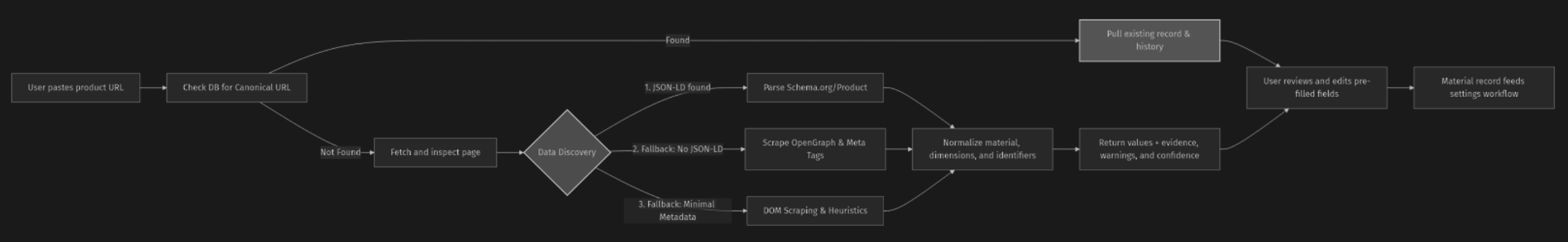 Variant URLs, product names, and material descriptions were often inconsistent. That drove the need for canonicalization, raw-plus-normalized values, confidence, and warning states instead of silent guesses.