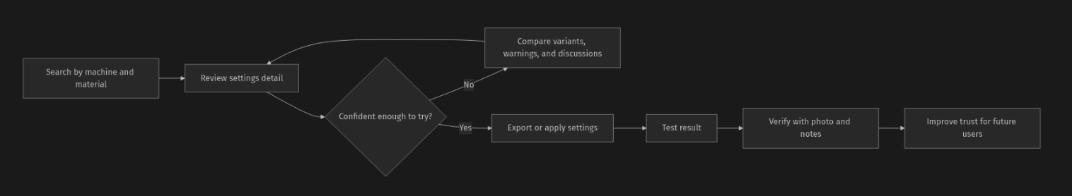 Users could often find settings, but not enough context to know whether those settings applied to their exact machine, material, finish, or intended result. That led me to treat trust as a workflow problem.